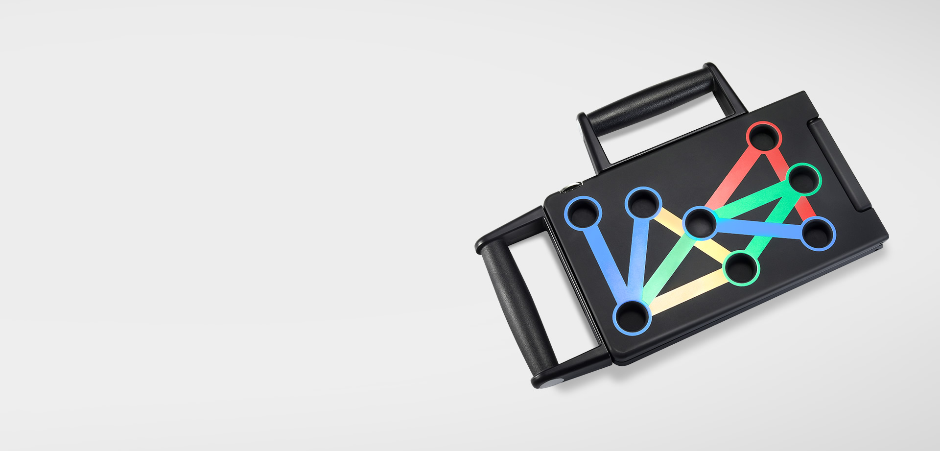轻量化ABS材质结合专利创新折叠设计,大大降低了支架的收纳面积及整体重量;俯卧撑折叠支架板搭配可拆卸把手,便于携带和训练,只要有平整的地面,展开支架就能开始锻炼。使用完毕后将其折叠上锁,支架即刻摇身变为小巧的手提箱,可随意收纳在家中任意角落。